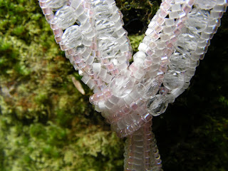 I found this pattern in a copy of bead and button magazine,i kept getting drawn back to it,which is odd as its not my usual style,or colours,pastels arrggg,so i decided to make it with the delicas i had on hand.I picked a transparent pink and a pearly white.